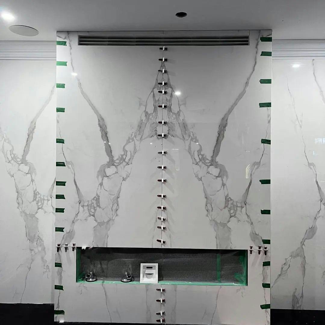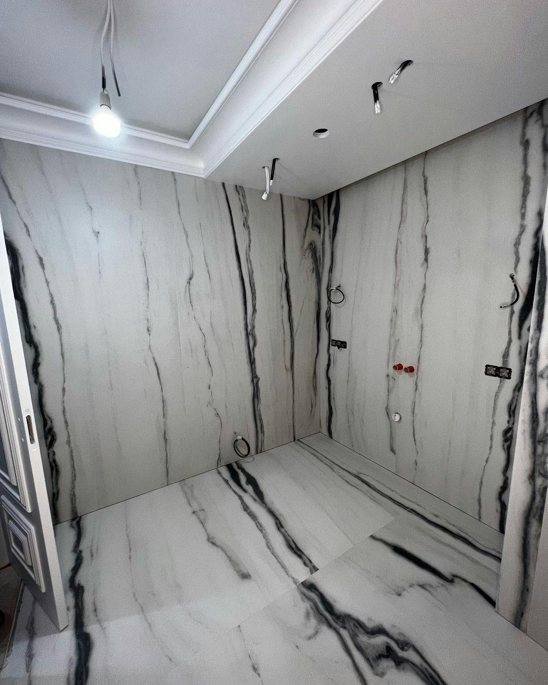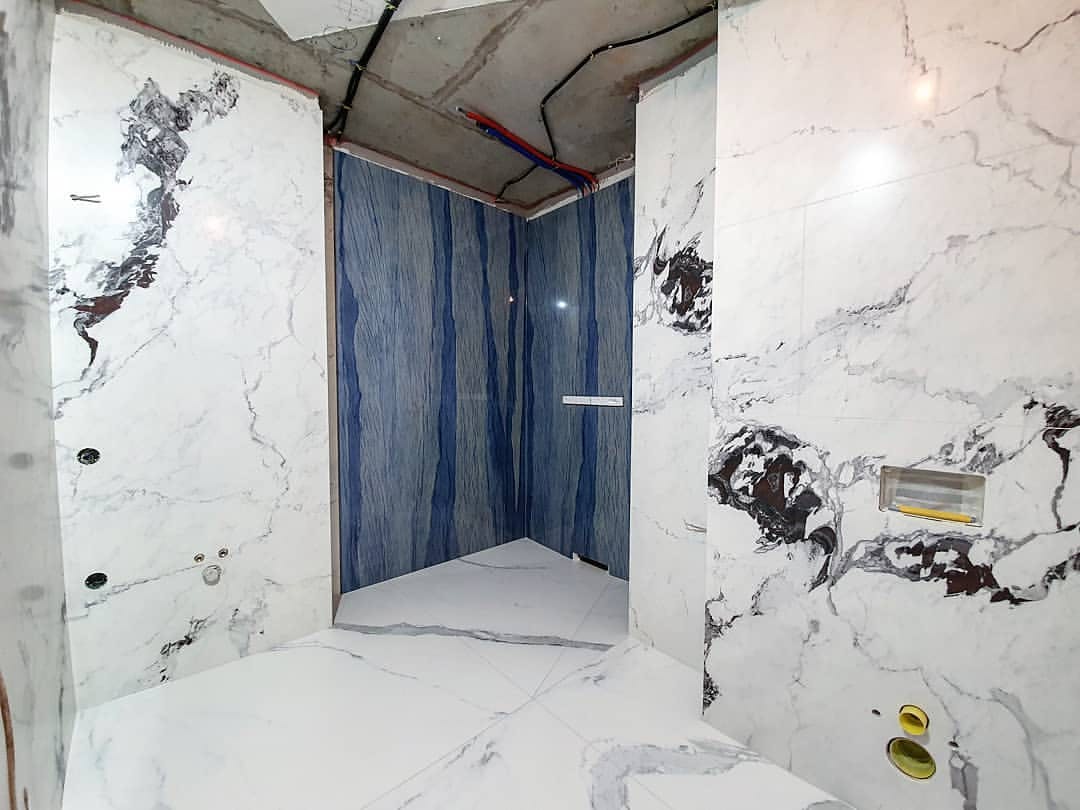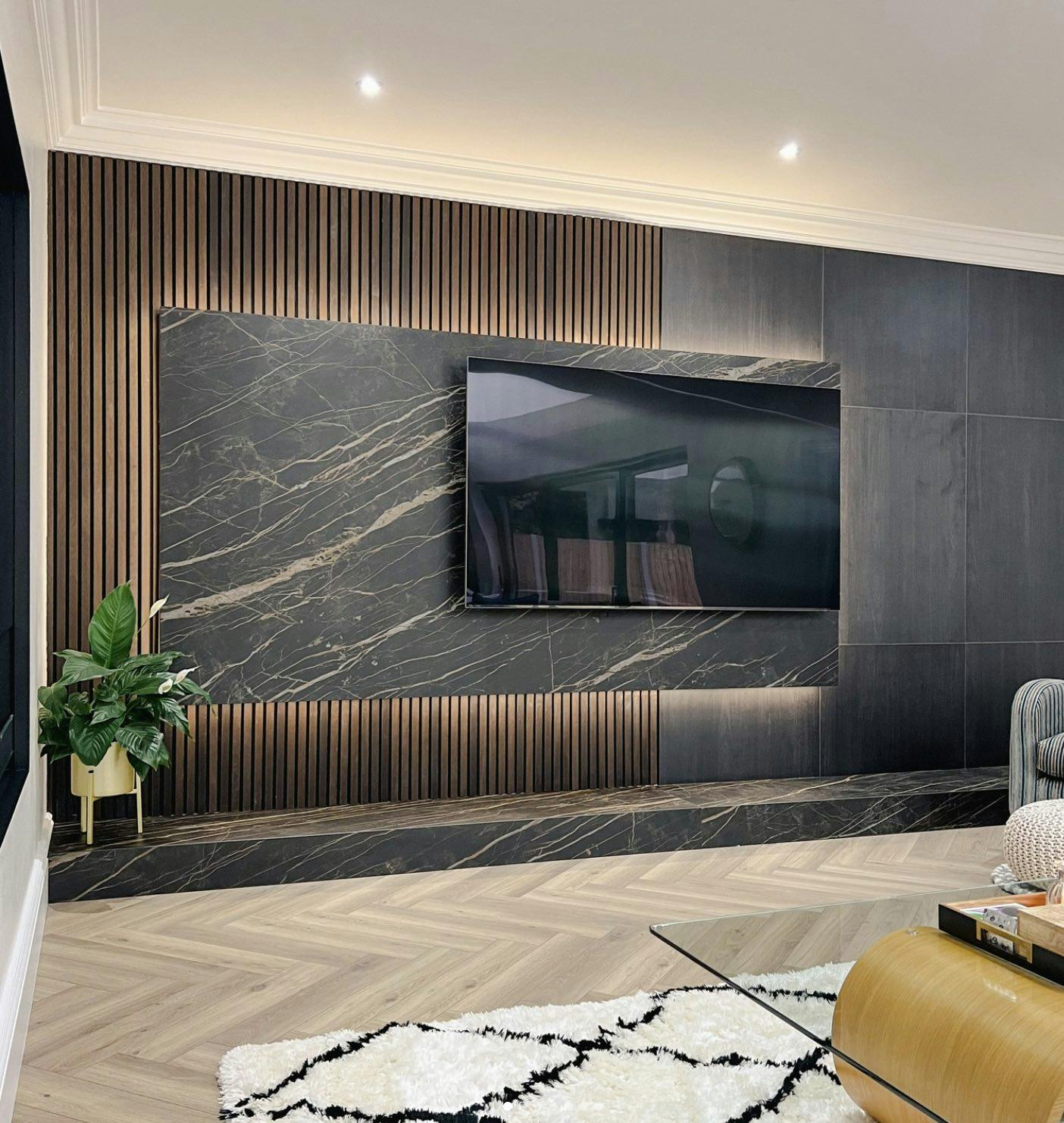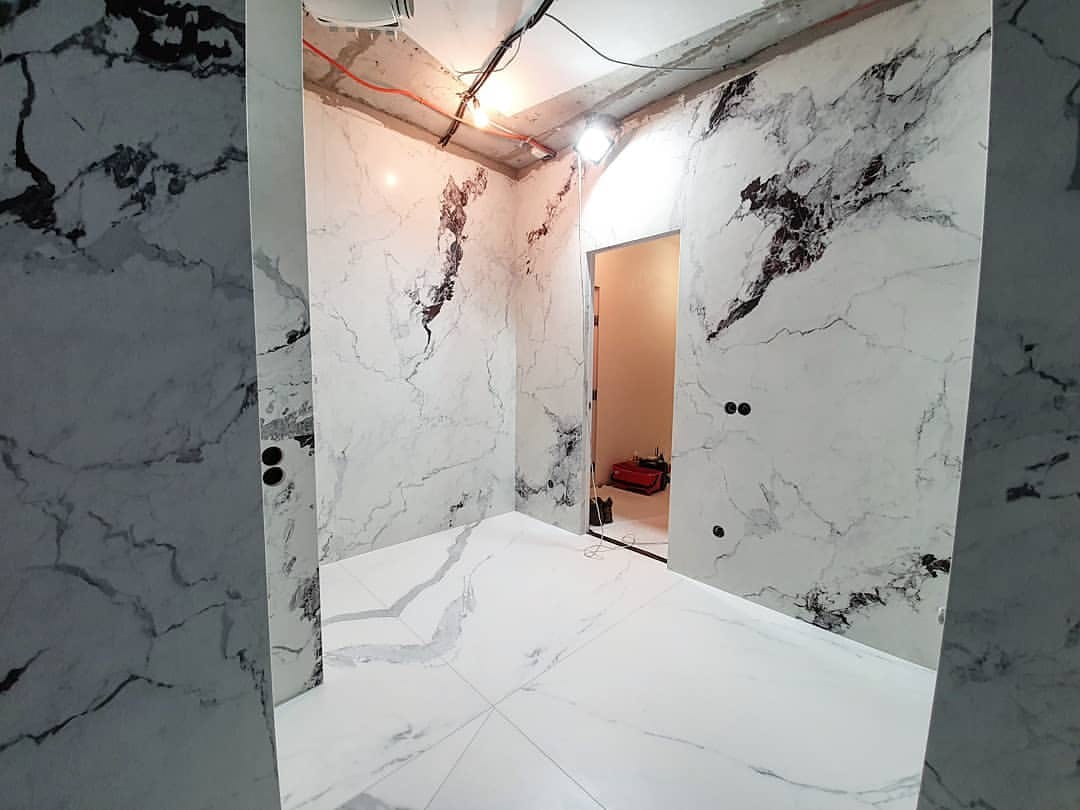 Облицювання стін широкоформатним керамогранітом у ваннній кімнаті. Облаштування Тв-зони та вхідних груп.