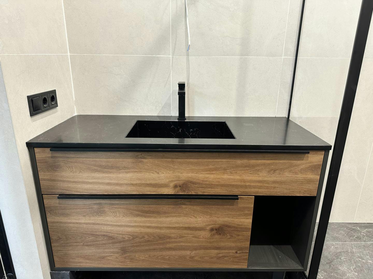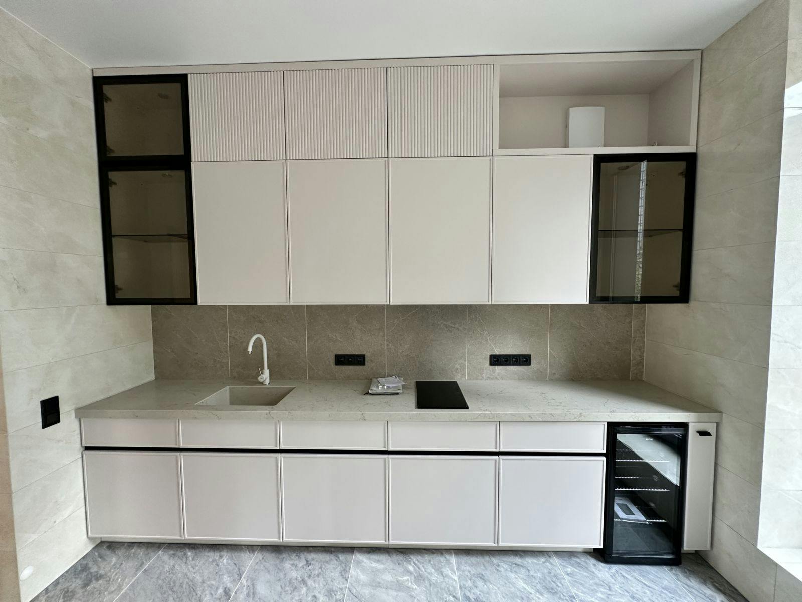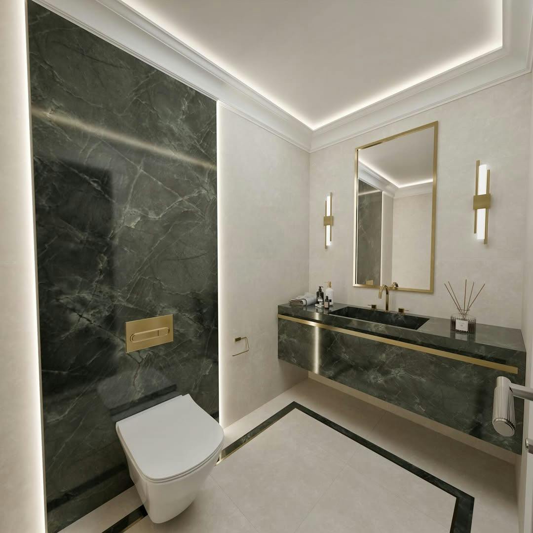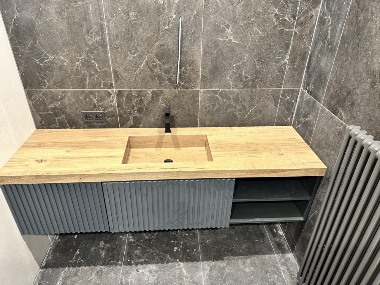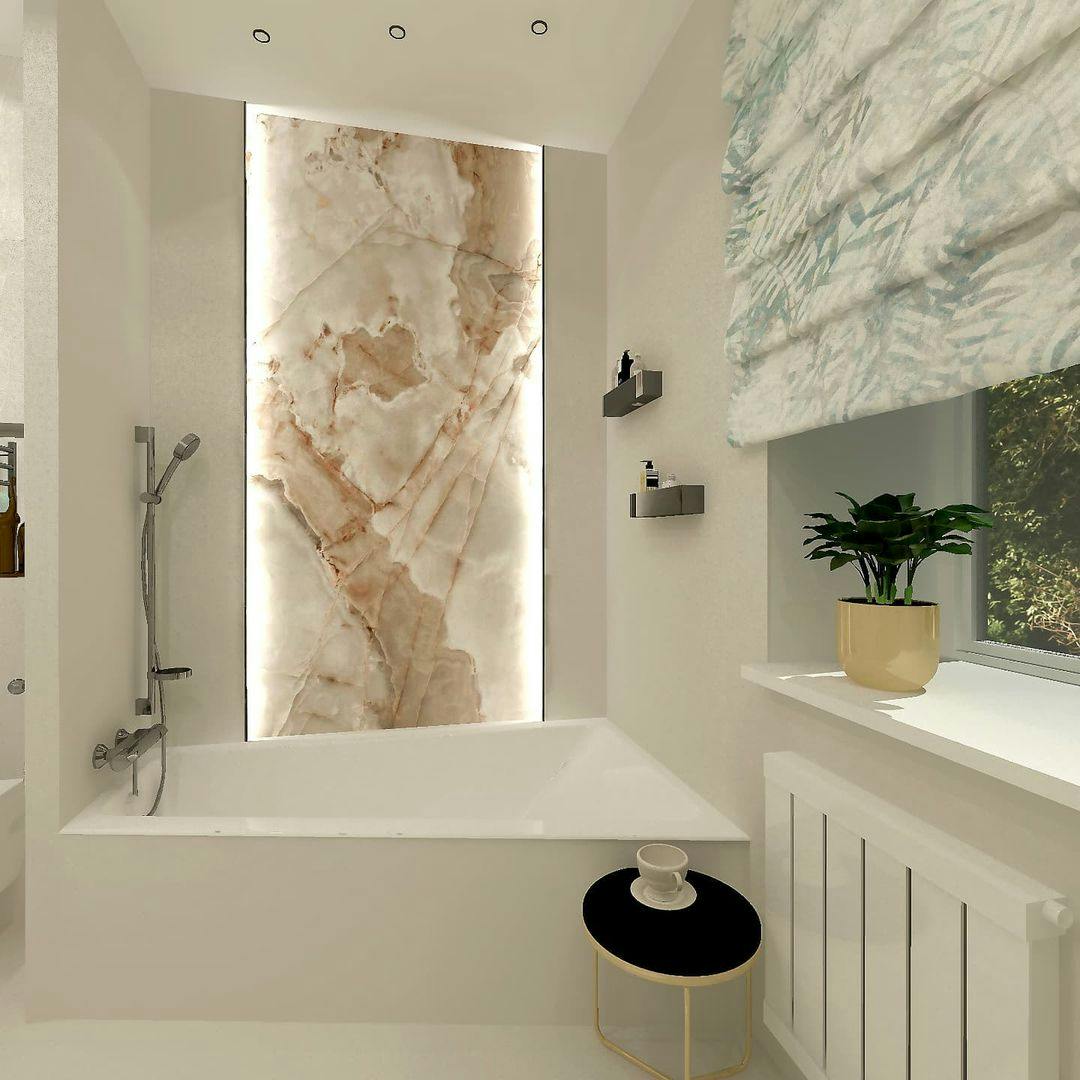 Облицювання стін широкоформатним керамогранітом у ваннній кімнаті. Облаштування Тв-зони та вхідних груп.