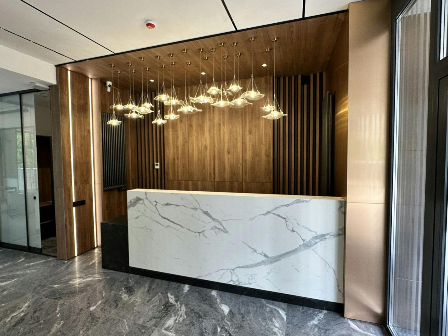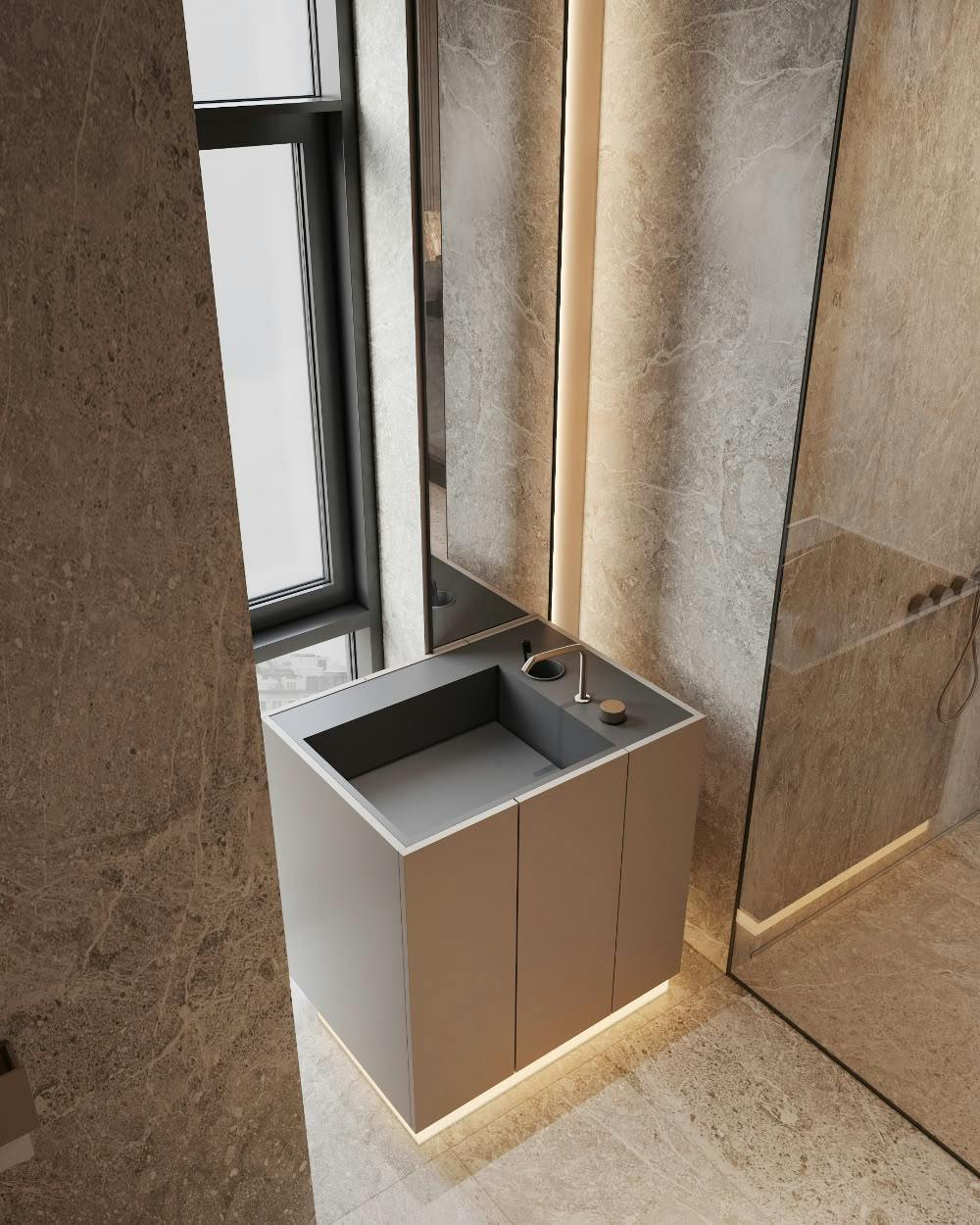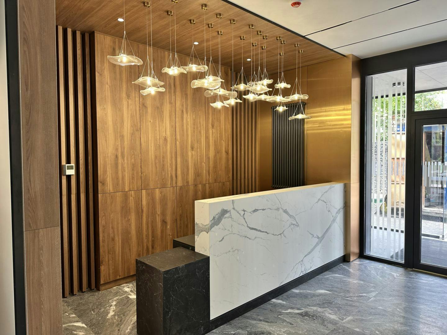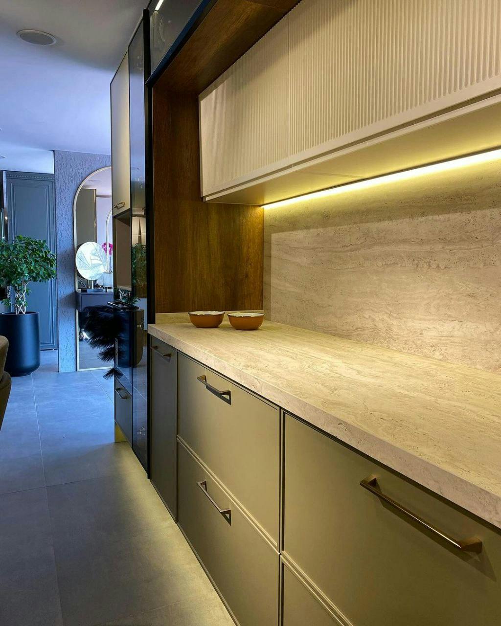 Облицювання стін широкоформатним керамогранітом у ваннній кімнаті. Облаштування Тв-зони та вхідних груп.